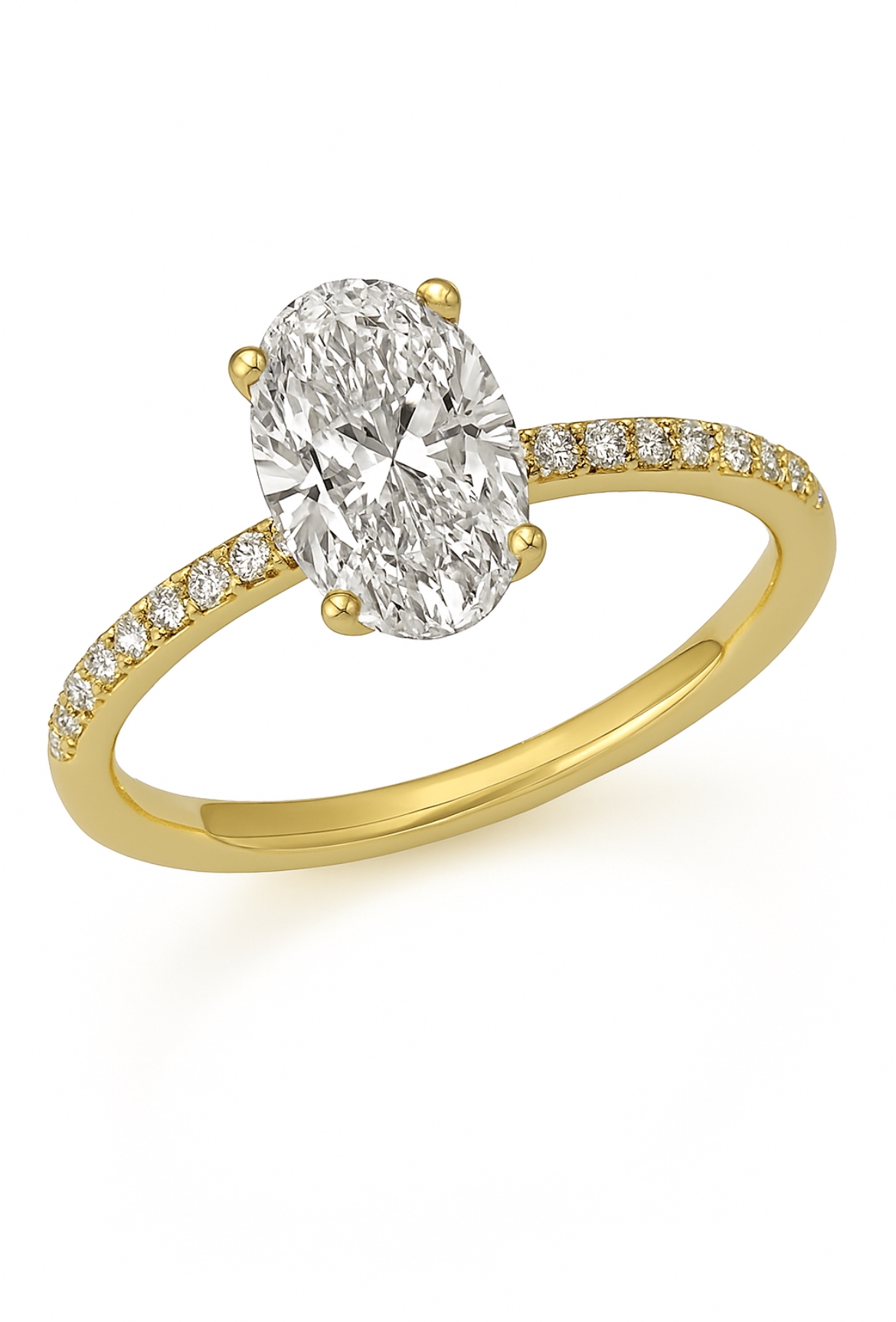 טבעת אירוסין קלאסית ומהודרת מזהב 14K, משובצת יהלום אובלי בקפידה ומוקפת יהלומים קטנים ליצירת ברק ונוכחות יוקרתית. השיבוץ המדויק מאפשר כניסת אור מרבית ומדגיש את האלגנטיות והיוקרה של הטבעת. זמינה בזהב לבן, זהב צהוב או זהב אדום לבחירה אישית.