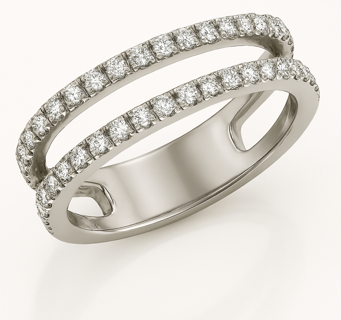 טבעת שתי שורות מזהב 14 קראט עם שיבוץ כפול של יהלומים נוצצים ליצירת מראה עשיר ומרשים. עיצוב אלגנטי ויוקרתי שמתאים כמתנה או כתוספת מושלמת לצד תכשיט אחר.