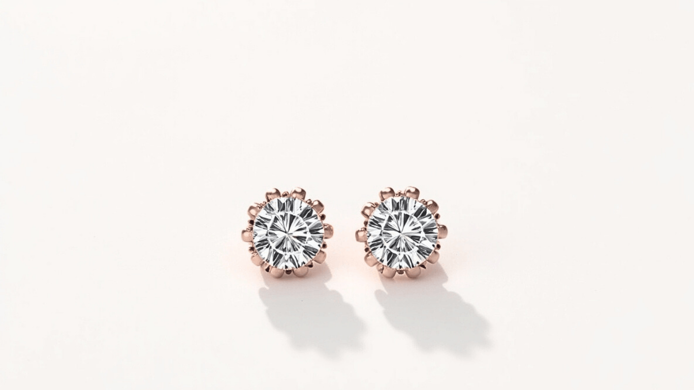 עגילי סטאד עגולים, משובצים ביהלום מרכזי מרהיב בליטוש מדויק, ומוקפים במסגרת זהב בעיצוב גלי המזכיר קרני שמש. עיצוב המשלב עידון ונוכחות עם קריצה רטרו מודרנית.