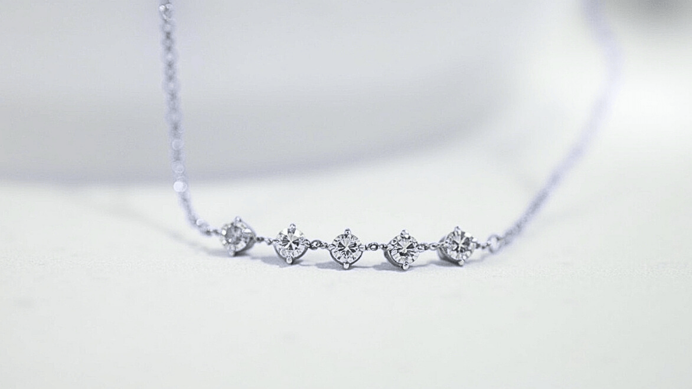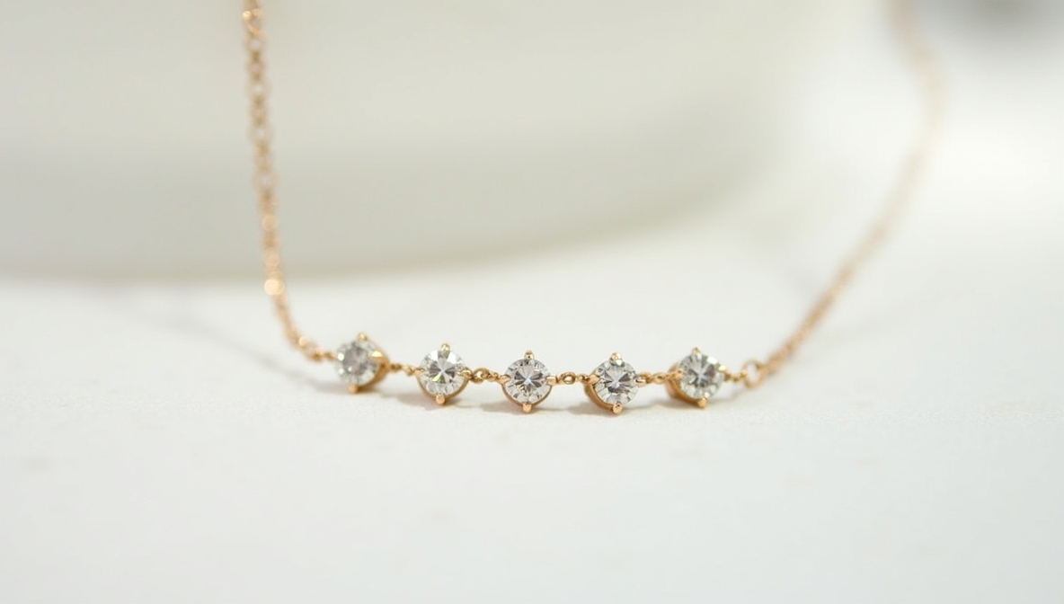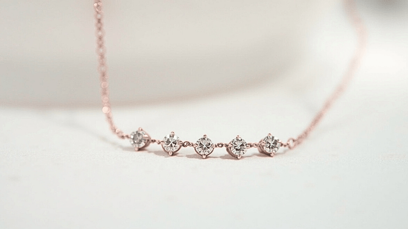 שרשרת זהב 14K רוז גולד עם חמישה יהלומים עגולים בשיבוץ עדין בקו ישר בעיצוב מינימליסטי ונקי.