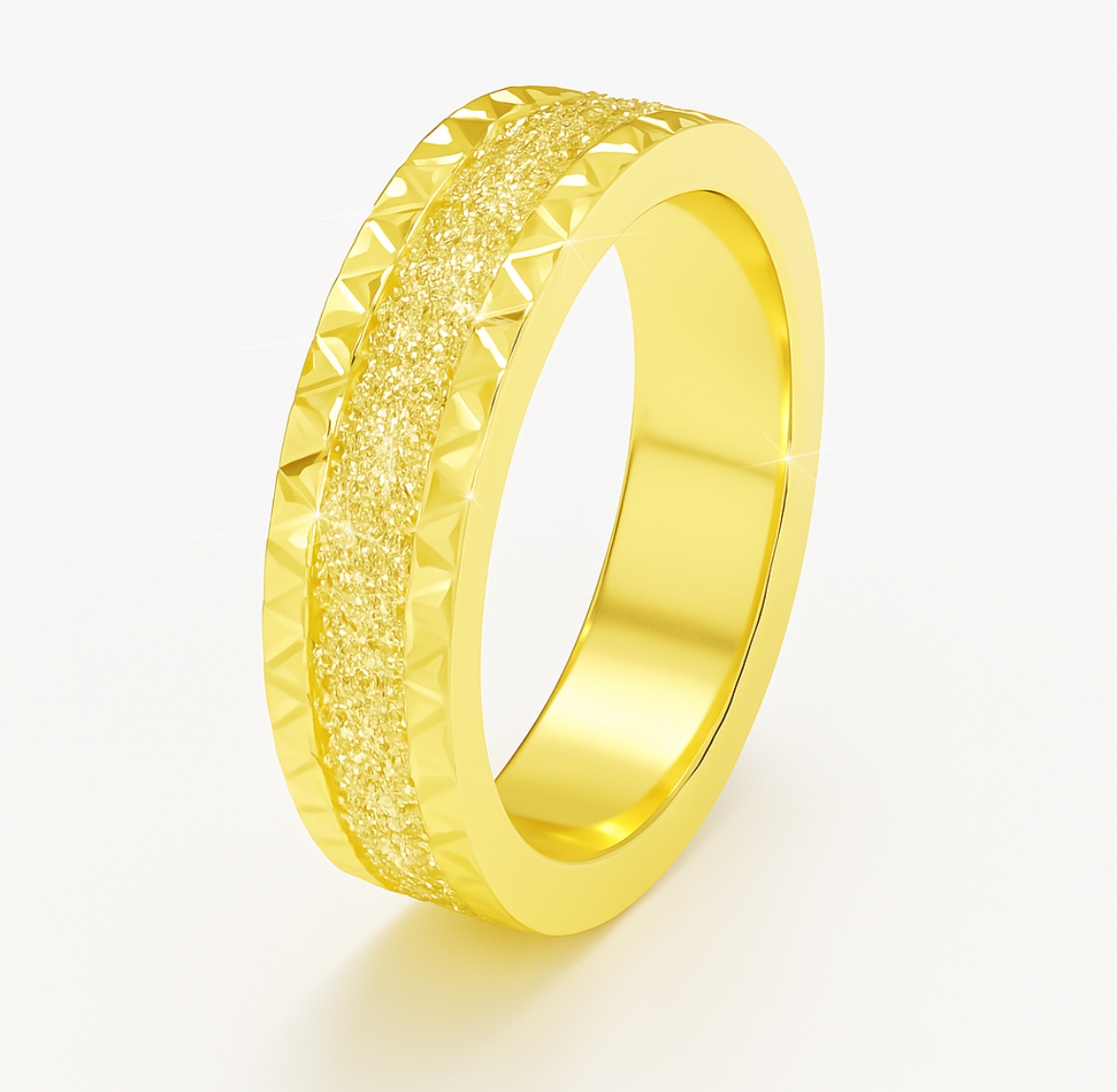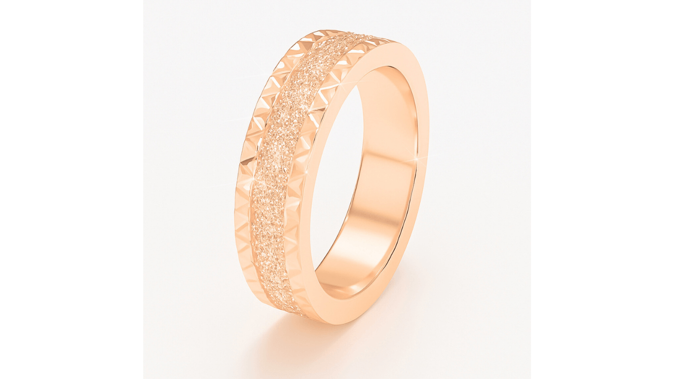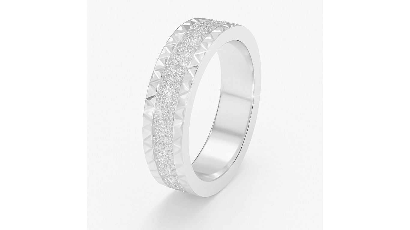 טבעת זהב 18 קראט רחבה עם מרכז דמוי גליטר ומסגרת גיאומטרית, טבעת נישואין עכשווית לנשים המעוניינות בעיצוב נוצץ וייחודי.