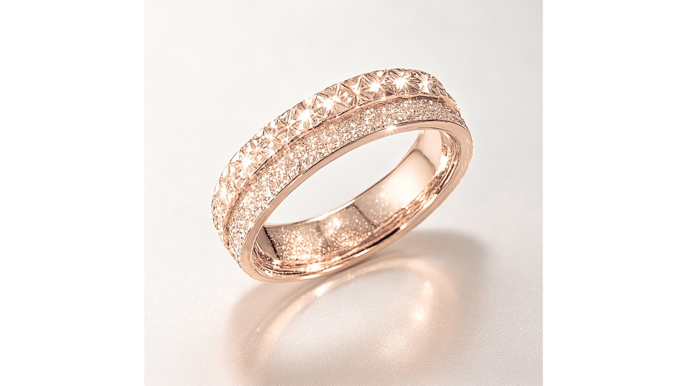 טבעת זהב 14 קראט רחבה ומפוארת עם פס מחוספס מנצנץ וטקסטורה כוכבית ייחודית, טבעת נישואין או טבעת יוקרה לגבר עם עיצוב מודרני ובולט.