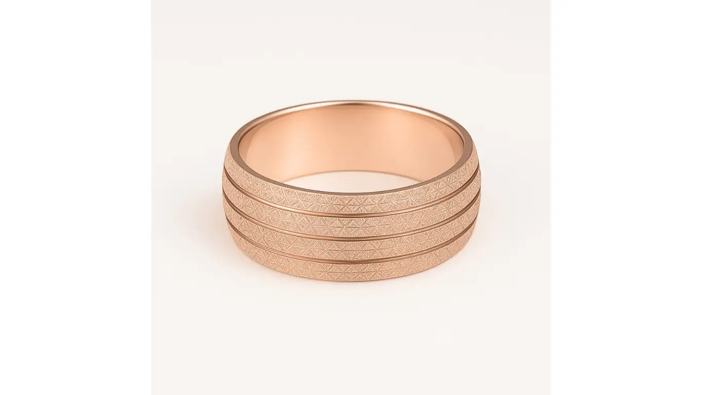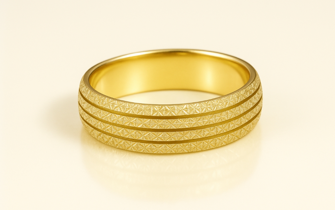 טבעת זהב 14 קראט רחבה עם שלושה פסים מחוספסים וטקסטורה מבריקה ומיוחדת, טבעת נישואין או טבעת יוקרתית לגבר עם עיצוב מודרני ואלגנטי.