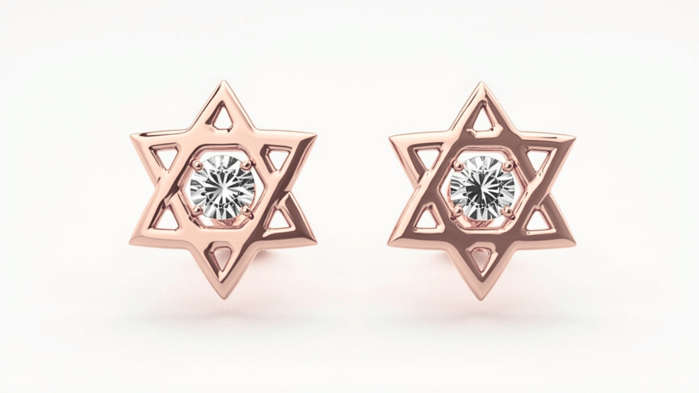 עגילי זהב 14K עם עיצוב כוכב דוד מוקפד ויהלום מרכזי נוצץ. עגילים אלגנטיים, מושלמים לכל אירוע, עם מראה עדין ונשי.