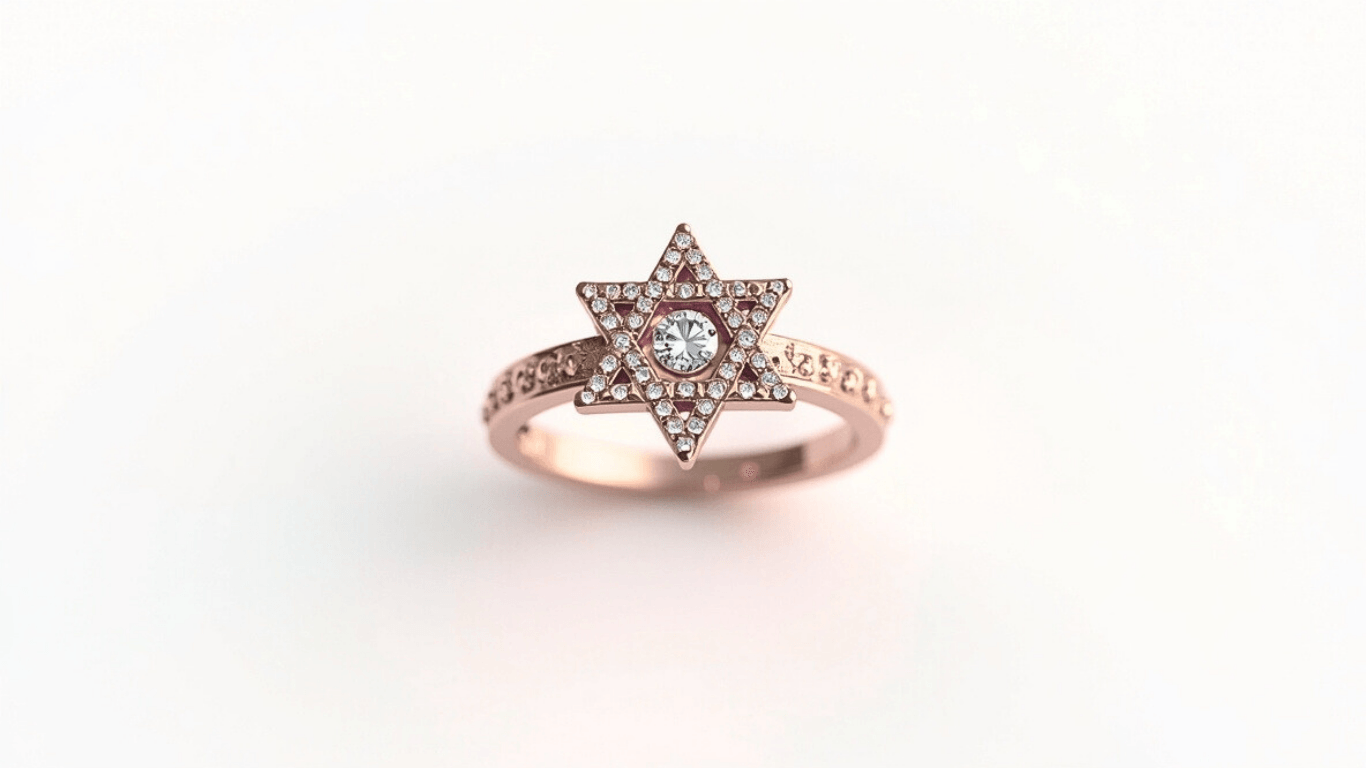 טבעת זהב 14 קראט בעיצוב מגן דוד ייחודי, משובצת בעשרות יהלומים נוצצים ויהלום מרכזי בוהק – סמל לאור פנימי, עוצמה והמשכיות. התכשיט המושלם לאישה שמחפשת חיבור בין ותות למסורת. מושלם כמתנה מרגשת לחג, יום הולדת או אירוע מיוחד.