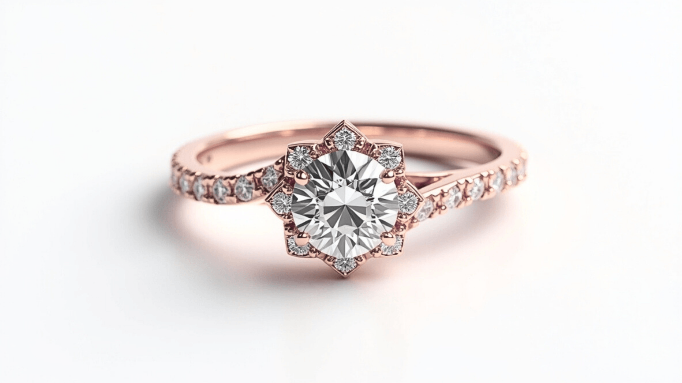 תמר טבעת אירוסין זהב 14K בעיצוב פרחוני ייחודי עם יהלום מרכזי בוהק, מוקף בשיבוץ צפוף של יהלומים קטנים לאורך הטבעת. שילוב מדויק בין עיצוב גיאומטרי קלאסי ואלגנטיות מודרנית, הופך אותה לבחירה מושלמת להצעת נישואין יוקרתית או מתנה בלתי נשכחת.