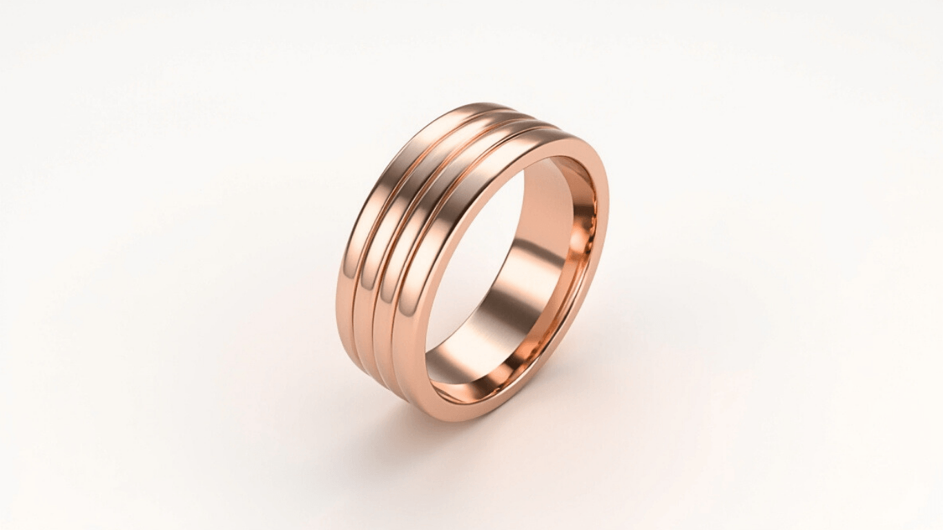 טבעת זהב 14 קראט רחבה עם חריצים אופקיים מעוצבים, טבעת כבדת משקל עם מראה מודרני ויוקרתי, מתאימה לגברים ולנשים שמחפשים טבעת בולטת ואיכותית.